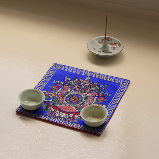 Tibetan Buddhist Ashtamangala Silk Brocade Shrine Table Cover Altar Cloth, 8”X8”, Blue/Red/Yellow