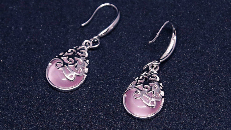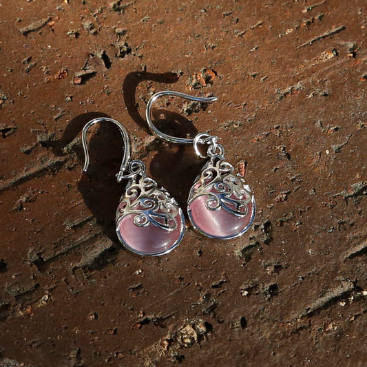 Cats Eye Silver Boho Chic Dangle and Drop Earrings, Pink or White