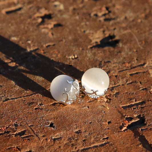 Cats Eye Sterling Silver Stud Earrings, Bohemian Style Simple Vintage Gem Stone Earrings (R)