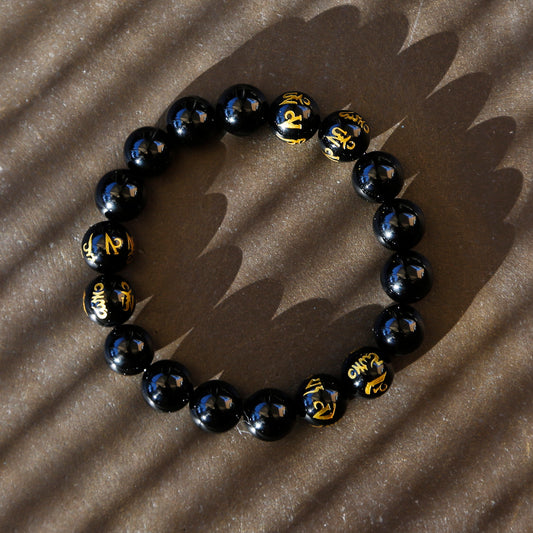 Buddhist Prayers Black Onyx Mens Beaded Bracelet, Tibetan Buddhism Prayers Mala Bracelet (Q)