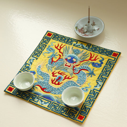 Oriental Chinese Dragon Silk Brocade Shrine Table Cover Altar Cloth, 10.5”X10.5”, Yellow/Red/Black