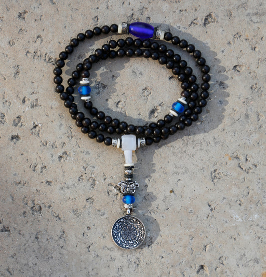 Tibetan Talisman Wood 108 Bead Mala Necklace, Black Wood 108 Bead Mala Wrap Bracelet