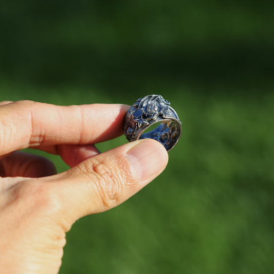 Vintage Style Embossed Peony Adjustable Silver Ring, Buddhist Sutra Mens Ring (S)