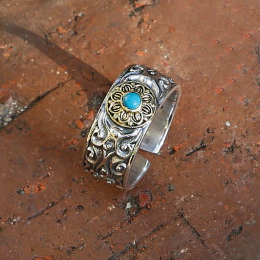 Vintage Style Embossed Flower Adjustable Silver Ring, Chinese Lotus Buddhist Mens Ring (S)