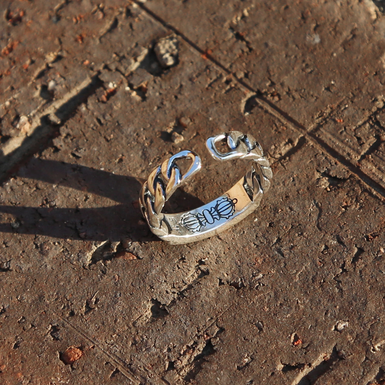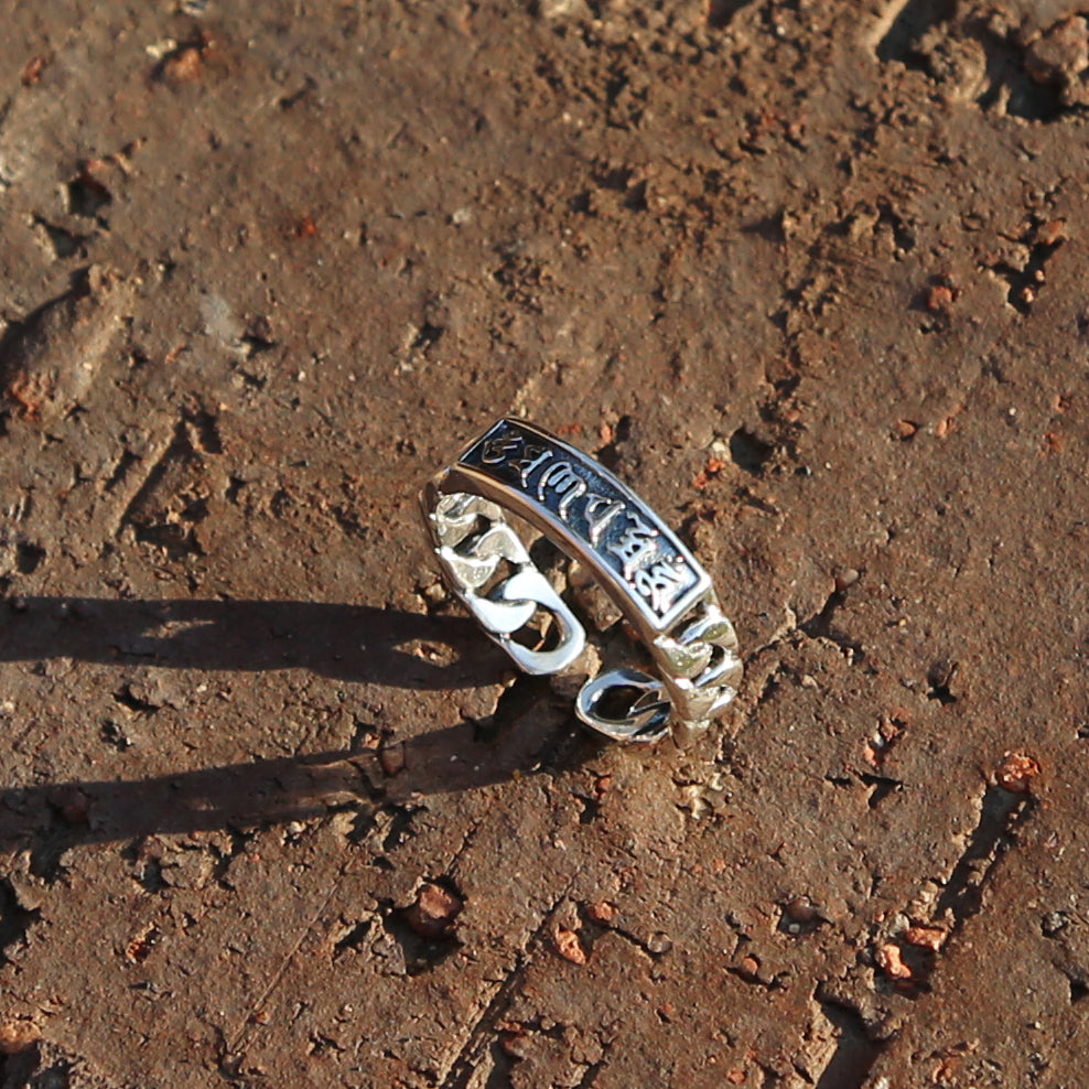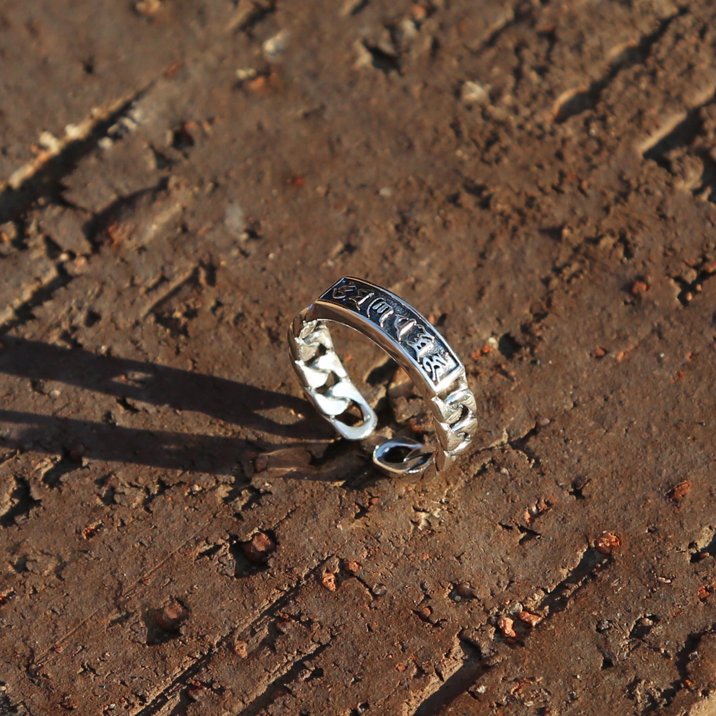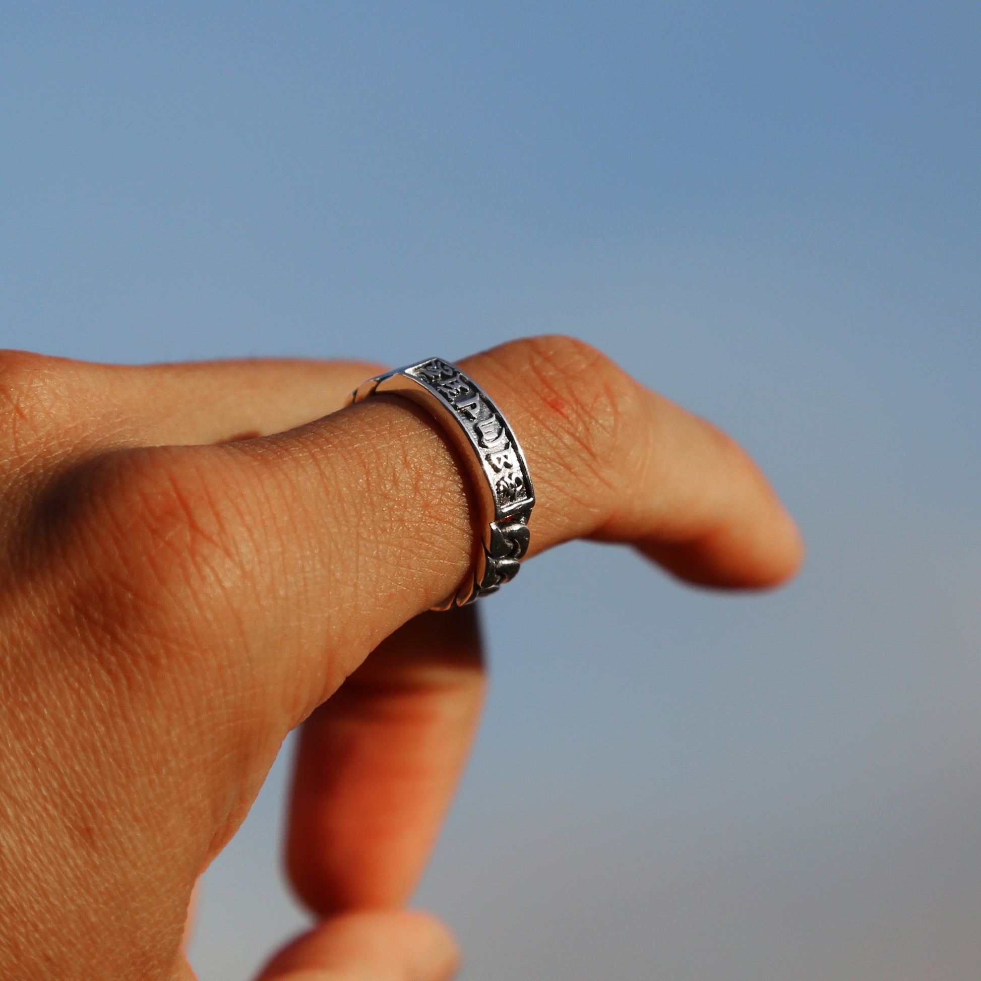 Introducing our Adjustable Chain-Style Buddhist Prayer Symbol Sterling Silver Ring, a fusion of spiritual symbolism and contemporary design, crafted for those who appreciate meaningful and stylish jewelry.