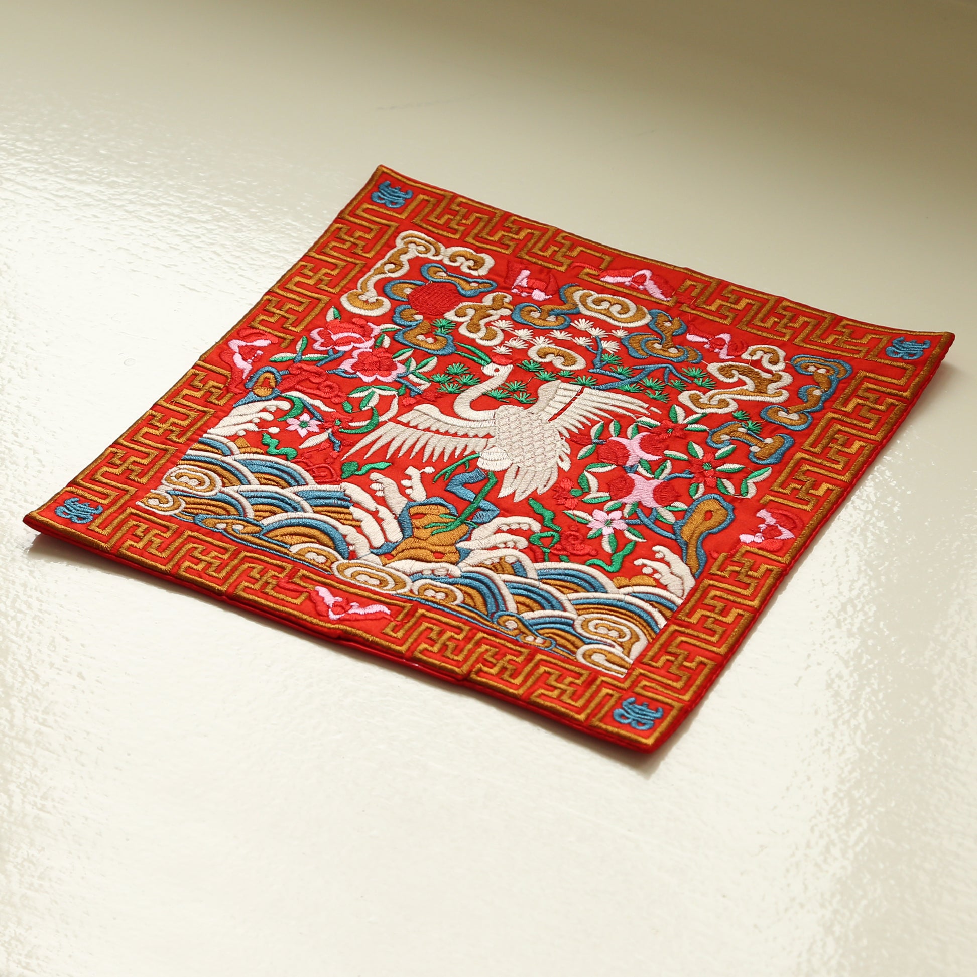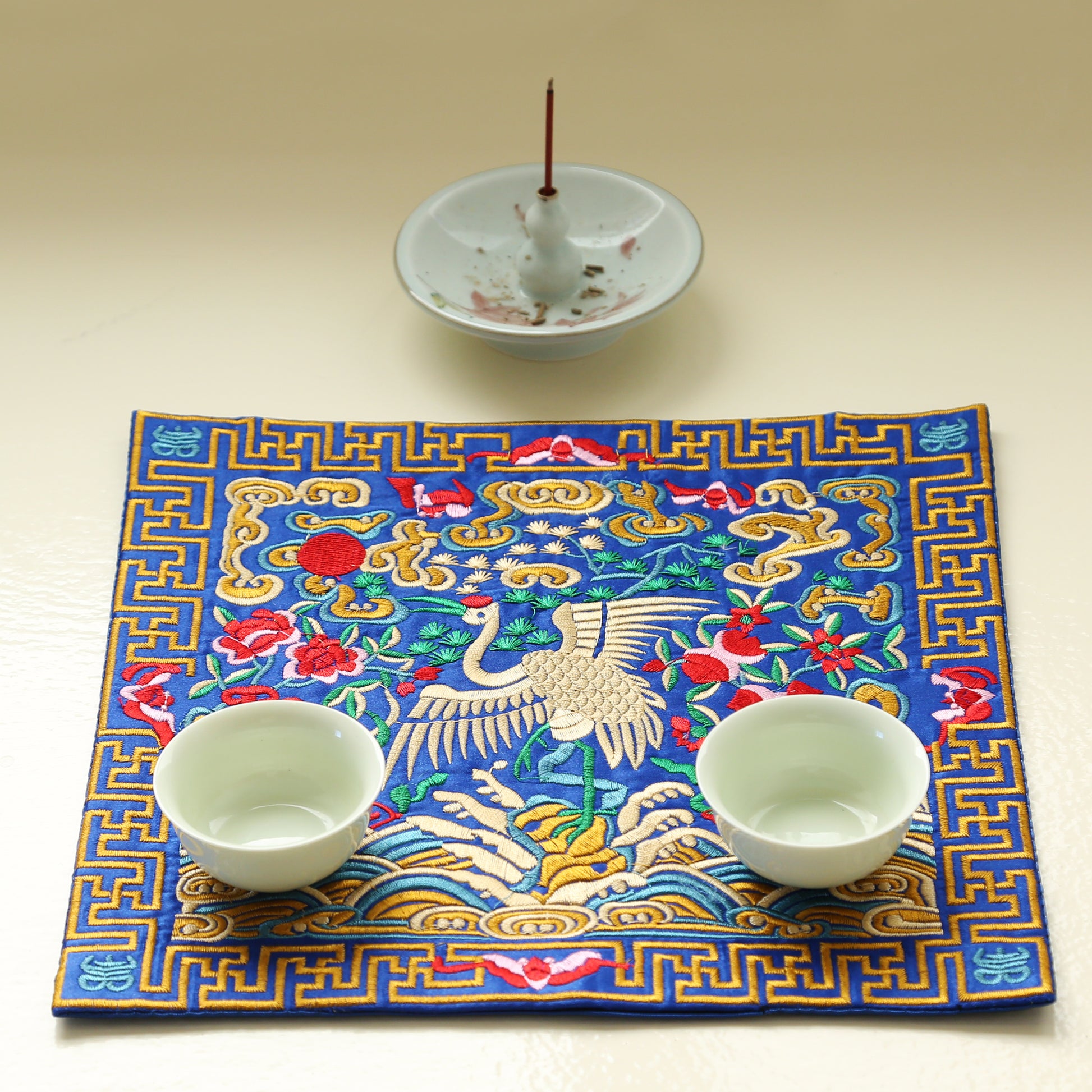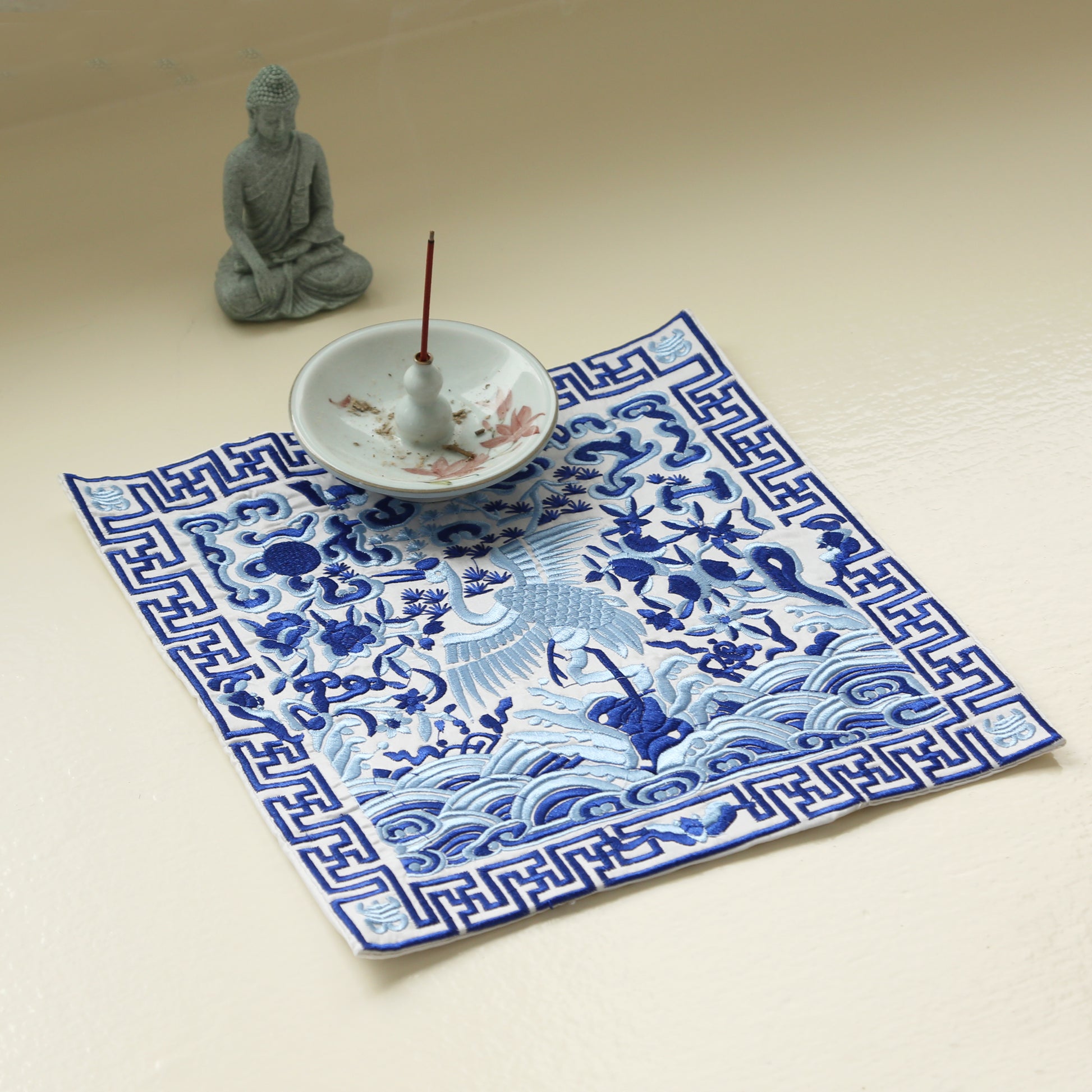 Chinese Japanese Crane Embroider Silk Brocade Shrine Table Cover Altar Cloth, 10.5”X10.5”, White/Blue/Red