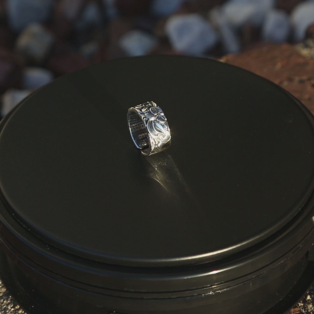 Embossed Lotus with Buddhist Sutra Adjustable Sterling Silver Ring, Tibetan Buddhist Ring, Om Ring (S)